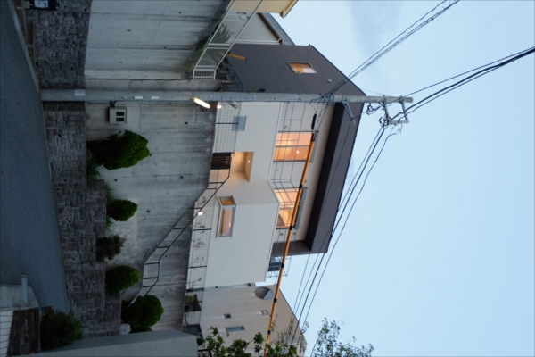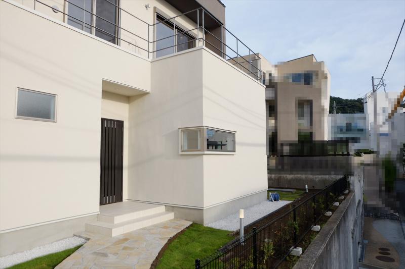 相模湾を臨む葉山の山あいに宅地造成された敷地に建つ2F建専用住宅眺望を最大限に活かす為に2階にLDKを配置していますさらに1Fの階高は高く設定されていて、普段はあまり見ることのできない軸組みとなっており、構造への配慮が感じられます。外階段をへてからの敷地に厳しい施工条件となりましたが、その分満足度の高い物件となりました。